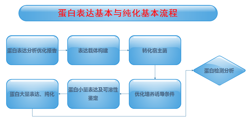 蛋白表达分析优化报告——表达载体构建——转化宿主菌——优化培养诱导条件——蛋白小量表达及可溶性鉴定——蛋白大量表达、纯化——检测分析