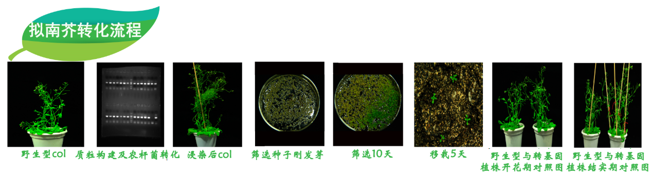 | 转基因拟南芥筛选鉴定 | 农杆菌介导遗传转化、筛选(花序侵染);T0代种子筛选;T1代阳性苗的PCR鉴定 |